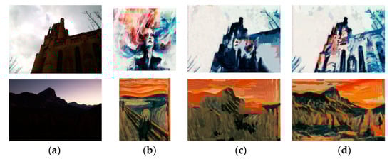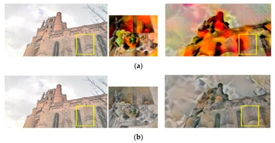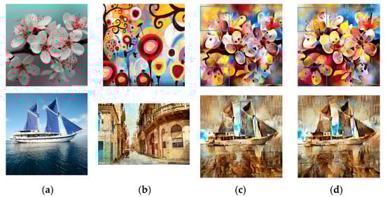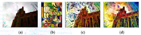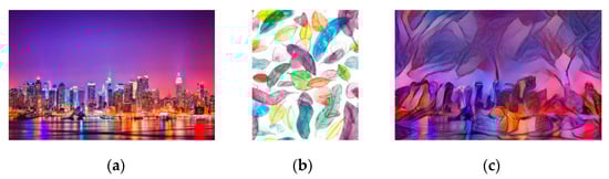 - Gatys, L.A.; Ecker, A.S.; Bethge, M. Image style transfer using convolutional neural networks. In Proceedings of the IEEE Conference on Computer Vision and Pattern Recognition, Las Vegas, NV, USA, 27–30 June 2016; pp. 2414–2423. [Google Scholar]