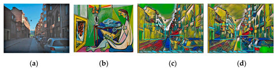- Gatys, L.A.; Ecker, A.S.; Bethge, M.; Hertzmann, A.; Shechtman, E. Controlling perceptual factors in neural style transfer. In Proceedings of the IEEE Conference on Computer Vision and Pattern Recognition, Honolulu, HI, USA, 21–26 July 2017; pp. 3985–3993. [Google Scholar]