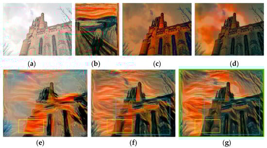 To evaluate the impact of the RNDT algorithm, an experiment was performed. The experiment results are shown in Figure 10, where is the content image with the color of style image. When the color dynamic range of content image is far smaller than that of style image, as shown in Figure 10a,b, the method of Gatys et al. [] cannot maintain the spatial structure of the content image. As shown in the yellow box of Figure 10e, sky area and building area are wrongly mixed together, while the RNDT method could overcome this defect. As shown in the yellow box of Figure 10f,g, the sky and building are distinguished, which benefit from the color pre-transformation. Furthermore, we find that the result based on RNDT is better than that of using Reinhard []. As shown in the blue box of Figure 10f,g, the result based on RNDT has more uniform color inside the building area. It could be explained based on the intermediate results of color pre-transformation, which are shown in Figure 10c,d. The linear color transformation algorithm of Reinhard tends to produce an excessive discoloration. However, the nonlinear RNDT algorithm has no excessive color change, which could maintain the spatial structure of the object.