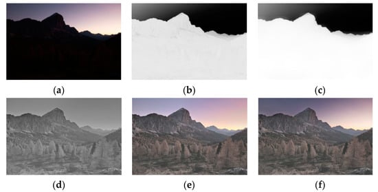 To illustrate the effectiveness of the DEMSR algorithm, the intermediate results are shown in Figure 11. These results correspond to different exposure correction steps in DEMSR, respectively. More specifically, Figure 6a shows an underexposed content image. Figure 11b,c shows the outputs of the adaptive backlit region detection. Figure 11d,e shows the results of the light restoration module. Finally, Figure 11 is the exposure correction image of the proposed DEMSR algorithm. Through the DEMSR algorithm, the light was restored and the details in the backlit region were enhanced.