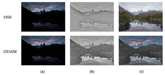 The light restoration results of the MSR algorithm and our DEMSR algorithm are compared in Figure 12. Since the object edge inside the backlit region was enhanced in the DEMSR, the output of DEMSR can show the details more clearly than the MSR algorithm.
