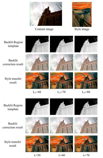 The adjustment of parameters and in the backlit region detection determines the effect of exposure correction. Therefore, we performed an experiment to evaluate the influences of these two parameters. The results obtained based on different values of the parameters are shown in Figure 13. From the figure, we can see that there is only a slight change between different style transfer results. Therefore, the proposed method is robust to the parameters and in a fixed range, e.g., varies from 60 to 80, while varies from 50 to 70.
