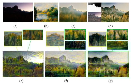 The results of Gatys et al., RNDT and EC-RNDT model on the underexposed content image: (a) content image; (b) style image; (c) ; (d) Mg, , ; (e) Gatys et al.; (f) RNDT; (g) EC-RNDT.