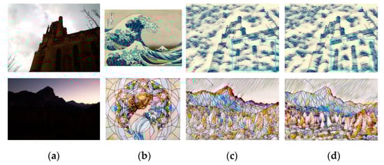 Since mid-1990s, different strategies have been used to preserve the structure of content images in the field of non-photorealistic rendering [,]. Song et al. [] and Kolliopoulos [] used a region-based algorithm to manipulate the geometry so as to control the local details. Hertzmann [] proposed a stroke-based rendering to guide the virtual strokes placement on a digital canvas to endow the content image a prescribed style. Efros and Freemand [] constrained the texture placement by the prior map exacted from content image, enabling the preservation of content and structure in content image. Even though the traditional artistic stylization can render a stylized image with original structure, it still lacks efficiency and flexibility.