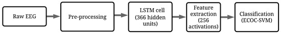 The resultant signal next has undergone a visual inspection of artifacts. Segments that contained artifacts were removed from the recording. Then, the first 60 s of data are eliminated since they are frequently corrupted by artifacts. Also, at the initial phase of recording, subjects are generally not comfortable yet. From the literature, most of the study used 60 s of recordings, indicating that 60 s of recording is enough to give reliable diagnosis outcomes using qEEG features [29,80]. Furthermore, the establishment of more discriminating characteristics of EEG appears at the beginning part of the recording [81]. Therefore, the next 60 s of the recording is extracted from the recording. Input to the proposed LSTM ECOC-SVM architecture is a 63 × 6000 matrix, representing 60 s of pre-processed EEG recording (i.e., one second of recording is equal to 100 data points). For each time step (i.e., one second), 100 data points are passed to the LSTM. The LSTM is trained using the input EEG for 60-time steps (i.e., 60 s of recording).