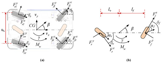 In practice, we can directly measure or estimate the lateral forces , and by using observer techniques [20]. As shown in Figure 1b, we will simplify the four-wheel model as a single-track model for the dynamic RLSC design. In this regard, we rewrite the lateral and yaw dynamics as follows