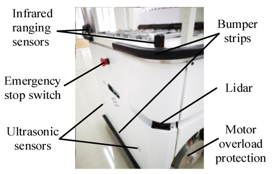 Since robotic technologies continue to develop in the automotive industry, mobile robots are being increasingly employed as a practical solution for mobile processing of large complex parts or logistics transportation [1,2,3,4]. Up to now, various types of mobile robots have been designed, such as two/three-wheeled mobile robots [5,6], differential mobile robots [7,8,9] and omnidirectional mobile robots equipped with Omni or Mecanum wheels [10,11]. Among the existing prototype, each wheel of two/three-wheeled or differential mobile robot usually has only one degree-of-freedom, implying the difficulties to perform omnidirectional movement flexibly in narrow spaces or confined environments [12]. As a typical differential-type mobile robot, the four-wheeled skid steering one can change its orientation by utilizing the actuation difference of each wheel, which may lead to inherent inefficiencies due to the skidding wheels [13]. Using Omni or Mecanum wheels, the omnidirectional mobile robot can realize effective omnidirectional movement without changing the direction of the mounted wheels. Such omnidirectional mobile robots allow for the lateral movement, but the rotation of rollers will result in the slippage of the mobile robot and the loss of ground friction interaction [14]. Moreover, the slippage is difficult to be modeled and identified. It is worth noting that in rigorous environments, the independently driven and steering architecture of four-wheeled autonomous mobile robots are beneficial for enhancing the maneuverability and applicability [15,16]. Specifically, the car-like in-wheel-motor-driven mobile robots (IWMD-MR) can sustain the free orientation regulation of the four-wheeled actuation system while providing better tolerance to surface irregularity and higher durability of tires. Given this context, IWMD-MR can achieve satisfying efficiency and actuation flexibility thanks to the special structure of the drivetrain [17,18,19].