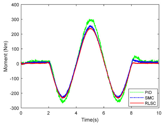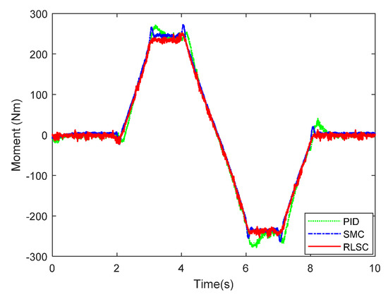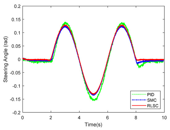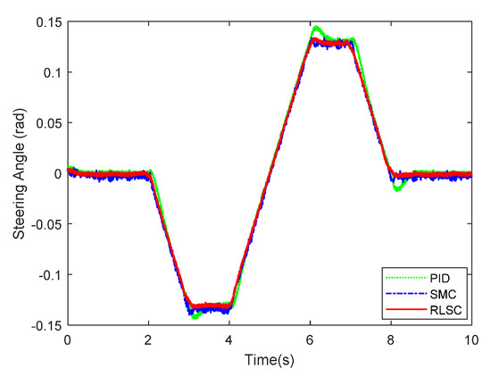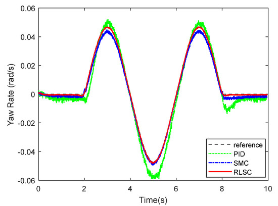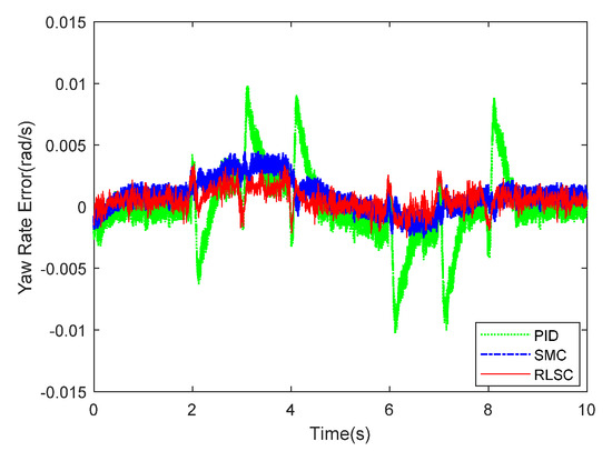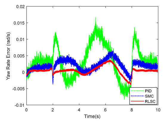 The experimental results of the yaw rate response exhibited in Figure 15 and Figure 16 show the corresponding tracking errors. From Figure 15 and Figure 16, one can conclude that the trajectory tracking errors of the yaw rate can be stabilized by the three comparison approaches. By applying the proposed RLSC, the lateral offset can be driven to steady states quickly, which is very critical for the autonomous mobile robots (including IWMD-MR) in emergency situations. Compared with the traditional methods (i.e., PID controller and SMC technique), RLSC can practically mitigate the response overshoot and increase the dynamic response. It should be pointed out that the tracking errors obtained here are relatively smaller than in Case 1. The reason lies in that the reference path curvature employed in Case 2 is much smaller than that in Case 1, and the steady-state errors of the yaw rate tracking can be reduced by our RLSC method during dynamic tracking.