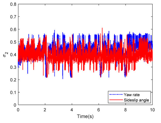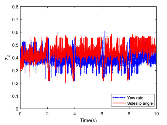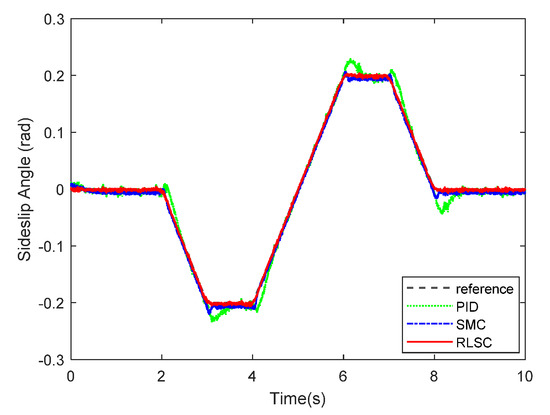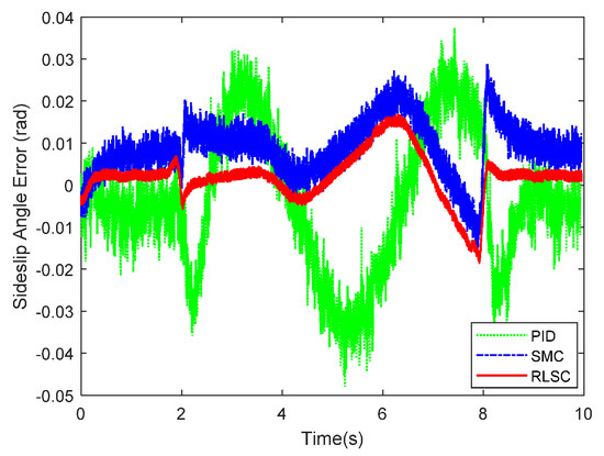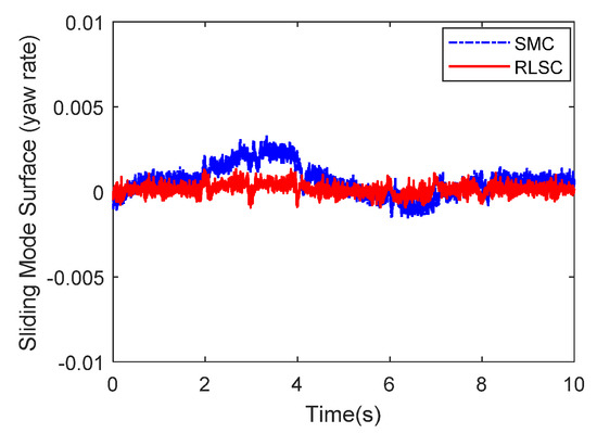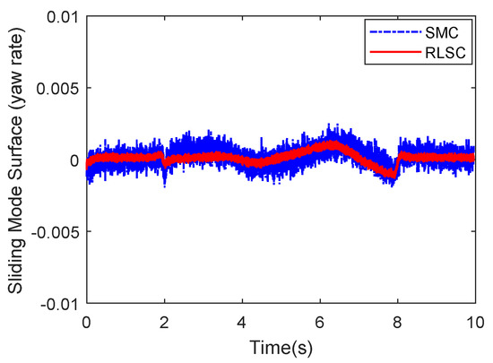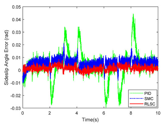 Likewise, the sideslip angle tracking response and related errors are presented in Figure 17 and Figure 18, separately. From these results, it is demonstrated that the system states are forced to be bounded closely to the desired trajectories. The tracking errors of the RLSC system can be bounded within a relatively smaller region around zero since the proposed RLSC can alleviate the fluctuations. Figure 19 and Figure 20 depict the front steering wheel angle and the yaw moment control input of this case, separately. As can be seen from these figures, the concerned two inputs can be bounded in reasonable regions. Similar to the results of Case 1, it is observed that the optimized control inputs determined by RLSC can mitigate the overshoots to a smaller region of zero compared to the traditional methods. In order to handle the unknown disturbance and improve system robustness, the traditional SMC may require overestimated control gains, which may result in a relatively large chattering of the tracking errors. Moreover, Figure 21 and Figure 22 demonstrate the scheduling tendency of the control gain and the estimated uncertainties in this case. Since the control gains can be adaptively tuned to accommodate the time-varying operating conditions, the proposed RLSC has potential for reducing the errors with respect to yaw rate and sideslip angle tracking. Figure 23 and Figure 24 show the corresponding sliding mode surfaces of yaw rate and sideslip angle, respectively. As can be seen from these figures, without the adaption of the control gains, the resulting sliding surfaces have a large range of variation, which may be caused by the system uncertainties and disturbances. Utilizing the proposed RLSC method with a fuzzy-based estimator to handle the unknown disturbances adaptively, one can obtain smaller and smoother sliding variables, achieving enhanced tracking response in terms of convergence and stability.