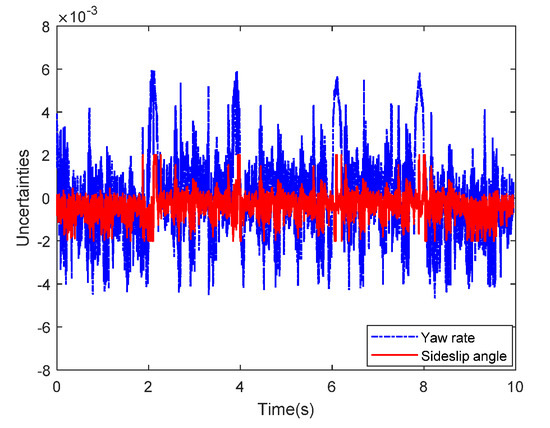 where and denote the nominal parametric matrix derived by using and , respectively, and denote the related nominal parameters, ΔA and ΔB denote the uncertainties caused by the vibrations of the tire concerning stiffness.