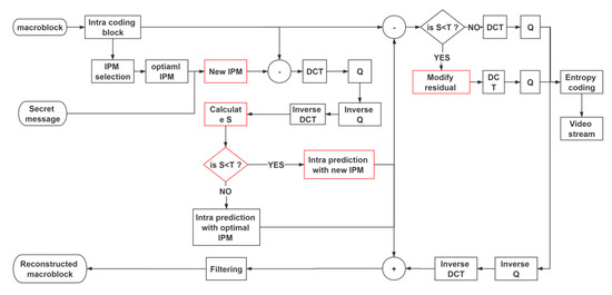 Steganography is widely used in digital media, such as image, audio and video [7,8,9]. In the past, many scholars focus on image steganography while only a few scholars are interested in video steganography. With the development of multimedia and the internet, video applications become more and more popular all over the world. In addition, video steganography has a large capacity and less distortion. Hence, video steganography has drawn more and more interest over the last few years. Generally speaking, there are four kinds of video steganography based on different positions: the intra-prediction mode [10,11], motion vector [12,13], Discrete Cosine Transform (DCT) coefficients [14,15] and entropy coding coefficient [16]. Because video steganography based on DCT coefficients and entropy coefficients considerably affect the video quality, only a few scholars focus on them. Most of the scholars focus on video steganography based on IPM and motion vector. Compared with inter-encoding, though, intra-encoding has a low computational complexity and low efficiency, which means intra-encoding will cost more bits to code one frame. On the other hand, it means the intra-frame has more redundant information when hiding secret messages.