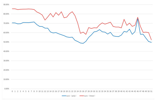 In this experiment, 118 video sequences were randomly selected for SVM training, and the remaining 60 video sequences were used for classification. Different SVM kernels were processed in this experiment. The experiment was executed 10 times to calculate the average accuracy rate. As shown is Figure 5, the security of our algorithm has great performance, especially when the QP is bigger than 10. In addition, the security of our algorithm can maintain stabilization during different quantization parameters.