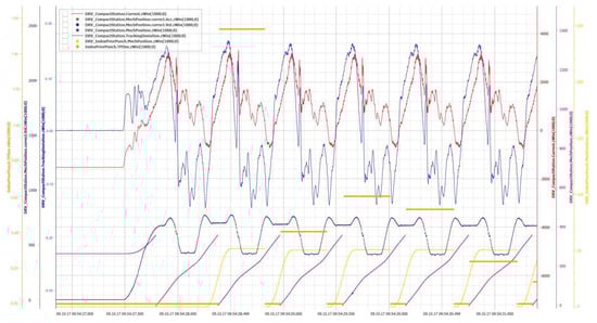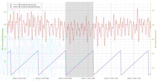 To tackle the aforementioned challenges, a sensor processing pipeline (SPP) is proposed, which provides solutions for capturing, processing, storing, and visualizing raw sensor data in a continuous processing pipeline. The latter is specified as a directed graph and describes the processing flow based on processing nodes, which are able to execute different signal data processing tasks. The SPP is able to correlate different data streams. For example, the virtual position of a compacting station of a pharmaceutical packaging machine can be derived by the correlation of a time date with a power signal. Figure 1 shows an example of different sensor data values that were gathered from a motor of the above mentioned compacting station of a pharmaceutical packaging machine. Note that the diagram was generated by a self-developed visualization tool. The diagram comprises signals for the power consumption (“Current.zWin”) and the positions (“mechPosition.*”) of compacting parts. Based on the power consumption values, the exact compacting process was derived by comparing them with the current positions of the compacting parts (“MechPosition.zWin”). Importantly, the signals were correlated by a windowing algorithm that was developed in the context of the SPP. It generates and processes the compacting station signal “TPDev.zWin” in a way that the amount of required signal samples to describe the compacting process is reduced by 98%. In the following, the SPP, its main technical contributions, and the prototypical implementation are shown along the example of a pharmaceutical packaging machine line.