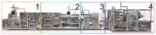 Generally, Uhlmann machines package tablets into individual packaging units, e.g., blisters. In this process, several single machines are connected to a machine line. Figure 2 shows a production line consisting of different machines. A blister machine forms blisters with individual courts for tablets from a plastic or aluminum foil strand. Tablets are then fed and sorted into blister courts. Blisters are finally closed with a cover sheet. In production Section 2, blisters are punched out and packed into cartons, together with the folded leaflet by a cartoning machine. Production Section 3 comprises a labeling machine, in which the cartons are labeled, e.g., with a country-specific code for traceability purposes. In the final production section (Section 4), cartons are packed into boxes, which are then stacked on pallets for transportation by a case-packaging machine. Note that in addition to blisters, tablets can also be bottled with Uhlmann bottle filler machines, meaning that Uhlmann offers packaging machines for syringes and vials as well.