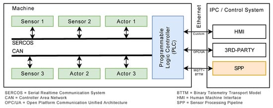 A programmable logic controller (PLC) is essentially a digital computer that is used, among other purposes, for the automation of industrial electro-mechanical processes, such as the control of a machine from a factory assembly line. PLCs have input lines, to which sensors are connected, and output lines, to which actuators are connected. The latter are used to mechanically react to incoming events (see Figure 3). Input and output lines may comprise bus systems, such as the Schneider Electric CANopen [], the Siemens Profibus [], and the Bosch Rexroth SERCOS []. The applications to control machine operations are developed using different programming languages (e.g., IEC standard 61131/EN 61131), and are stored in non-volatile memory. A PLC is an example of a complex real-time system, as its output results must be produced in response to input conditions within a limited time period; otherwise, unintended operation may be the result. Typically, a PLC is connected to other information systems, such as industrial PCs (IPCs), equipped with human–machine interfaces (HMI) to configure and to control the PLC execution. Additionally, third-party components can be connected through the use of standard protocols or control systems, such as the OPC UA []. In the following, the binary telemetry transport model (BTTM) is presented, which was chosen for the prototypical implementation as it revealed fast and efficient transmissions of sensor data between PLCs and the other developed components of the prototype.