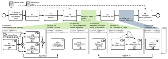 In order to present common problems of cyber-physical processes, we conducted a study in the field of production machines [,]. Therefore, the maintenance processes of a pharmaceutical production machine had to be collected (see Figure 6). It was revealed that during the execution of the maintenance processes, different variants occur. Figure 6 shows an excerpt of a maintenance process. In addition to activities that must be always performed, such as “A2: Check Equipment,” there are activities which are only performed if a certain situation occurs. For example, the activities of the process fragment “CalibrateFormingStation” are only performed after execution of activity “A4: Conduct Cleaning” in case that the situation “poor blister pocket forming” occurs. This is represented in Figure 6 by the green area “Variable Part 1: Conduct Cleaning.”