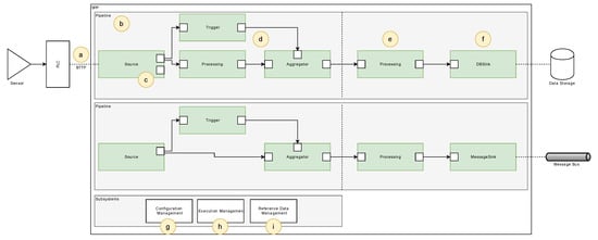 Donovan et al. present a big data pipeline for integrating, processing, and analyzing industrial equipment data in the large []. A study was conducted in a manufacturing facility of the Johnson and Johnson group to observe technologies, architectures, and configurations in a real-world industrial environment. One research question concerned the development of a big data pipeline to support equipment maintenance. The presented architecture comprises distributed software agents that collect time series of industrial equipment and forward them message-oriented to a cloud service that provides a data repository. The stored time series can then be pre-processed using a processing component, and for example, be aggregated by time period. Furthermore, normalized time series are analyzed and interpreted in a batch-oriented manner. The architecture presented does not provide any further details about the concepts and technologies that can be used for pre-processing and analysis.