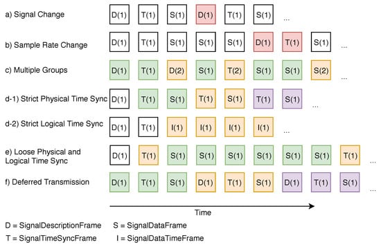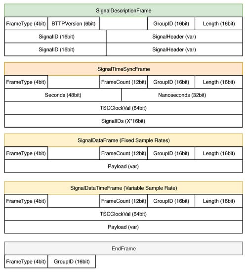 The Message Queue Transport Protocol (MQTT) and the Advanced Message Queuing Protocol (AMQP) are application layer protocols for message-oriented middleware systems [,]. They can be used to transfer sensor data as well. The developed binary telemetry transport model (BTTM) is lightweight, binary-encoded, and poses less overhead. It offers specific frames for time synchronization and can be also used as a payload format for MQTT and/or AMQP, which offer error correction, session management, and security methods, such as authentication or transport encryption.