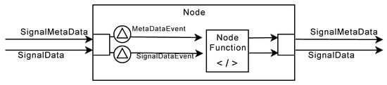 Regarding data stream processing, various related works exist []. Borealis is a stream processing system developed by three universities: Brown and Brandeis Universities and the MIT []. Borealis is based on the research projects Aurora and Medusa []. It has a graphical interface that allows one to graphically model the stream processing. As in KNIME or RapidMiner, individual processing components, here boxes, are linked to each other. However, the Borealis system is based on SQL-like, continuous queries, and has similarities to Esper and CEP. It implements eight basic operators, including one that enables windowing []. These operators, in turn, enable sliding windows known from CEP, or tumbling windows and their special forms. However, the concept of correlating windows does not exist. The other operations are also based on the functions known in SQL or the Continuous Query Language (CQL). Specifically, filter, groupBy, and join operations are provided that filter individual elements from streams, create groups, or merge multiple streams. Notably, only the map operation allows for a user-defined function to be applied to all tuples within a stream. Thus, the concept of nodes in the SPP is more flexible. Contextual sources and meta-information about individual streams are not modeled separately in Borealis. Thus, contextual information must be added to the individual data streams by means of union operations. Likewise, necessary meta-information must be transported within the streams. To conclude, the concepts shown for the SPP component—with respect to sensor data processing—are in line with the advantages shown for Borealis. However, Borealis includes components, such as a graphical interface or a runtime tracking, that are not yet included in the SPP, but can be easily implemented. A common concept in the field of digital signal processing is called signal flow graphs (SFG). It was firstly introduced by Claude Shannon []. SFGs represent a set of simultaneous linear algebraic equations, for example, to characterize and analyze sequential electronic circuits. A linear SFG consists of nodes and weighted directional edges. The nodes are the variables of the equations and the branch weights are the coefficients. Signals may only traverse a branch in the direction indicated by its arrow. The elements of a SFG can only represent operations, which are sufficient to represent constrained equations. When a signal traverses a branch in its indicated direction, the signal is multiplied by the weight of the branch. When two or more branches direct to the same node, their outputs are added.