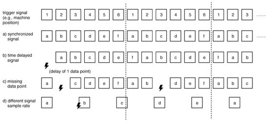 In the context of the Industrial Internet of Things (IIoT), the advent of condition monitoring, predictive maintenance, and continuous improvements has influenced many technical solutions and furthered new technical developments [,]. Among others, one commonality of these approaches is that they rely on proper data sources, which are provided by machine sensors and their recorded data. As manufacturing machines normally comprise a multitude of sensors, one major challenge constitutes the feeding procedure of massive sensor data to downstream processing components. Available sensors must detect different sensor values to a high standard and regardless of the sensing purpose. For example, the detection of the temperature of a forming station is different to the temperature detection of a compacting station since their sensors generate data in different data formats; i.e., a conversion into standardized data formats becomes necessary. As another challenge, some sensors record data in an equidistant manner, while other sensor data values can only be recorded in a non-equidistant manner; i.e., based on cycles. Moreover, sensor data streams often pose (1) gaps or unexpected endings and (2) different sampling rates. Besides the discussed sensor differences, sensor data are typically delivered from sensor subsystems (e.g., a programmable logic controller, PLC) and continuously streamed to subsequent processing components, which must then cope with massive amounts of data. Therefore, it is important to perform the required processing tasks of sensor data in parallel. However, when utilizing parallel computing techniques in this context, time synchronization challenges must be considered. For example, if data from two different sensor signals have to be regarded for an analysis, an exact time-synchronization between these two signals must be ensured. Therefore, digital signal processing solutions are heavily used in manufacturing settings, as described here.