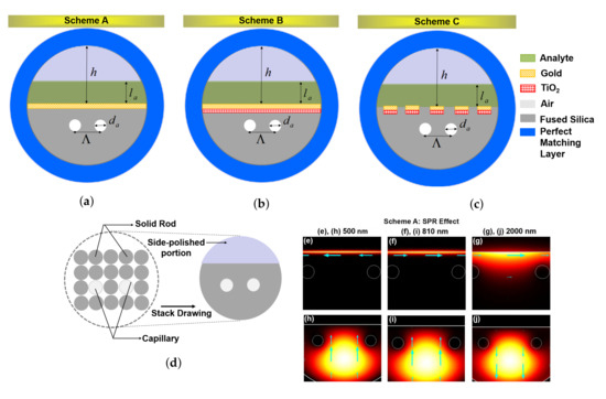 The proposed simplest structural D-type twin-hole PCF based plasmonic micro biosensors are characterized by using the finite element method (FEM). Figure 1a–c describe the geometrical cross-sections of the three different Schemes as A, B, and C (i.e., Au-coated, Au+TiO-coated and Au+TiO-grating assisted). In all the schemes, the diameter of the air-hole, , is 2 m and hole-to-hole spacing, , is 5 m. The thickness of the Au layer is analyzed from 40 to 60 nm in both schemes A and B. On the silica substrate, the air-holes are configured in order to trap the field to the center of the sensor and to strongly interact with Au. In Schemes B and C, TiO is used as a thin layer and as a grating, respectively, in-contact with a silica substrate for strong adherence. The essential material parameters such as RI of silica, Au, and TiO for the simulation are fetched from Refs. [21,22,23]. The layer thickness of Au and TiO in Schemes A and B are defined as and . In Scheme C, Au and TiO grating thickness are defined as and , respectively. The perfectly matched layer (PML), , is a simulation boundary that absorbs the scattering waves from the fiber. An analyte layer thickness, , 5 m is considered. Here, and are followed similarly in Schemes A–C as shown in Figure 1a–c. Additionally, the crucial subset of fiber based SPR sensors consists of fibers with a discrete-metallic pattern, reinforcing LSPR, employed on the fiber D-shaped surface as shown in Figure 1c. LSPR excitation is permissive by the same restraints as propagating SPs that necessitate shallow interactions between the metal surface and analyte, allowing for the excitation of localized SPs at adjacent deep interactions. Consequently, LSPR based sensors may be demonstrated directly on the straight cleaved on the fiber D-shaped surface that enormously elucidates the sensor architecture. LSPR based sensors are an attractive platform owing to the relative simplicity of the practical realization. However, LSPR is known for being admissible sensitive to refractive index changes when compared with sensors based on propagating plasmons. The stacking capillary diagram of the proposed PCF-RIBS is depicted in Figure 1d. It can be fabricated using capillary stacking technique [24]. The D-shaped portion of the fiber can be realized by the side-polishing technique [25] and, in this work, the polishing height, h, is 12 m. The CVD technique has been adopted for coating metal as thin film and grating in nano-scale [26]. A CVD may be employed for a wide variety of base materials such as ceramics, glass, metals, and metal alloys as thin-films, and also helps to coat precision surfaces like metal-grating including the seal areas and internal surfaces. In addition, the CVD technique can withstand exposure to low, moderate, and high-temperature variations. In particular, the CVD remains bonded in high-stress environments and when the surface flexes owing to high adhesion characteristics. Effective PML is simulated by applying the boundary condition for improving the accuracy of the results [27]. External D-type sensing is channelized on the corrugated surface of the proposed fiber so that core-guided field interacts closely with an analyte-sample from 1.33 to 1.45.