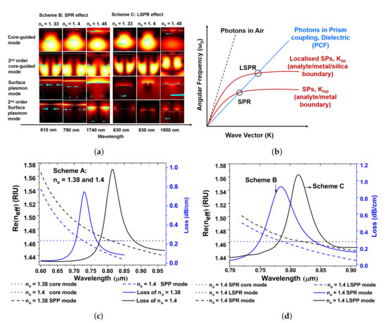 It is known that the coupling of plasmonic mode (PM) or the localized surface plasmon with the core-guided fundamental mode (FM) at a resonant wavelength is known as SPR in a PCF [5,18,19,20]. By characterizing the resonance condition in PCF-RIBS, the FM, PM, and SPR modes at three different wavelengths 500, 810, and 2000 nm are depicted in Figure 1e–j. For 500 nm, in the lower wavelength range (500 2000 nm), the FM and PM are tightly confined when compared with that of the higher wavelength of 2000 nm. Figure 1 describes the 2D cross-sectional view of the proposed sensing schemes and indicates the polarization direction, showcasing an arrow plot. The arrow surface plots describe the wave vector directions for the incident field and the 2D cross-sectional mode wave vector of each order of modes. Maxwell’s equations framing up the normal component of the electric displacement field have to be continuous across interfaces between materials with different refractive indices. Henceforth, the normal component of the electric field needs to be higher in the material with the low refractive index. This may be employed to improve and confine the guided mode into a narrow domain with a low refractive index regarding the slot domain. The dimension of this low refractive index domain is on the orders of tens of nanometers which keeps the optical energy tightly confined to a narrow area giving a high optical energy density in the waveguide, as denoted in arrow plots. Figure 2a describes the mode field distribution of FM and PM for various analytes of = 1.33, 1.4 and 1.45. It is obvious that the field distribution of the FM and higher-order FM modes as well as PM and higher-order PM modes increases with increase in , along with an increase in wavelength. This results in an increase in confinement loss of the modes. The FM and PM in Figure 2a demonstrate the phase matching conditions of Schemes B and C for = 1.33, 1.4, and 1.45, explaining the both SPR and localized SPR analysis. Figure 2b describes the two different SPR couplings that happen between different PM and the photons propagating in PCF. The SPR and LSPR mode couplings are clearly explained in Figure 2a. As the effective RI of the FM and SP is a function of resonant wavelength, the field distribution increases with an increase in . Consequently, the ionization of electrons shows a large mode field distribution in LSPR, which improves the spectral sensitivity. Figure 2c depicts the propagation loss spectrum (solid curve), dispersion relation of the FM (dotted curve) and PM (dashed curve) of Scheme A i.e., the Au-coated D-type twin-hole PCF-RIBS for = 1.38 and 1.4. Here, the performances of the sensor such as confinement loss (CL), wavelength sensitivity (WS), and amplitude sensitivity (AS) are calculated using following the relations [5,18,19,20],