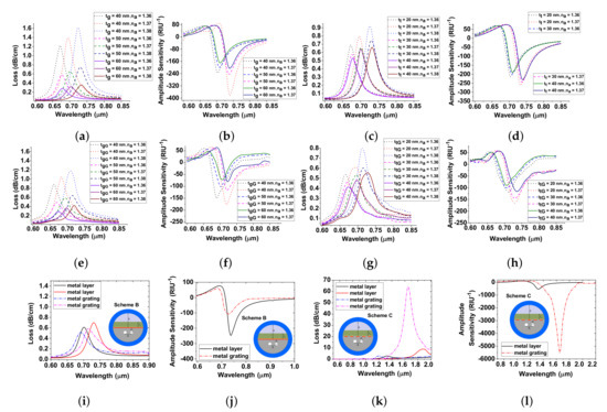 (a–d) confinement loss and amplitude sensitivity with and variations; (e–h) confinement loss and amplitude sensitivity with and variations; (i–j) confinement loss and amplitude sensitivity for SPR and LSPR at shorter wavelengths; (k–l) confinement loss and amplitude sensitivity for SPR and LSPR at longer wavelengths.