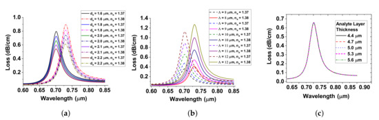 Having optimized the thickness of and for LSPR, the next step is to optimize the diameter, pitch, and analyte layer. Here, we vary the air-hole diameter, , from 1.6 m to 2.4 m and pitch, , from 8 m to 12 m in steps of 0.2 m when = 1.37 and 1.38. From Figure 4a,b, it is obvious that the confinement loss increases with increase in and also the resonant peak wavelength gets shifted to the larger wavelength. From Figure 4c, it is clear that the twin-hole D-type PCF-RIBS experiences low loss when is smaller and the loss peaks remain similar as variation is negligible when is increased.