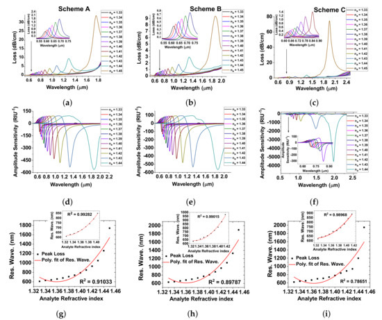 In addition, the linearity of the proposed sensors of Schemes A, B, and C is depicted in Figure 5g–i, respectively. It is clear that the resonant wavelength increases with an increase in analyte-RI environment of 1.33 to 1.45. Here, the Scheme A achieves a good linearity performance of R = 0.91033 for the analyte-RI environment of 1.33 to 1.45 as shown in Figure 5g. In addition, the R value becomes 0.99282 for RI between 1.33 to 1.42, which is shown as the inset in Figure 5g. Figure 5h represents the sensor Scheme B whose R value is 0.89787 for = 1.33 to 1.45. However, the R value is 0.99015 for RI between 1.33 to 1.42. For Scheme C, the R value is 0.78651 for RI between 1.33 and 1.45. However, the R value turns 0.98968 for RI between 1.33 and 1.42 as described in Figure 5i. Therefore, the R value proves that the proposed sensing schemes are efficient to analyze the analyte-RI environment of 1.33 to 1.45 of chemical and biological samples.