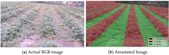 The “Thorvald” platform from Saga Robotics (Agricultural Robotics Company, Ås, Norway) is used for gathering the dataset. The robot is mounted (Figure 1) with the RGB module and a Stereo Camera named Intel Realsense camera D435 (1920 × 1080 max resolution, Rolling Shutter, 69.4 HFOV, 42.5 VFOV, Intel Corporation, United States). The camera is attached using mounting accessories at the height of 1.05 m and 0.785 m in driving direction from the center of the robot. The camera publishes RGB images of size 640 × 480 at the rate of 6 fps. Since the semantic segmentation requires a set of data covering the crops’ diversity, we made a dataset collection campaign on different periods in the strawberry fields with a group of sensors mounted on the robot. The data is recorded in the form of rosbag files provided by ROS. The images are gathered with the RGB camera along with depth information obtained from stereo cameras and can be accessed by the ROS image topic in the respective bag file. The annotations are done by the open-source annotation tool Labelme [], which gives the annotated images with the label values for each associated pixel. Figure 3 displays the overlay of annotated mask over the corresponding RGB image in which the labeled classes like Background, Crops, and Lanes are stored as 0, 1 and 2 values in the image.