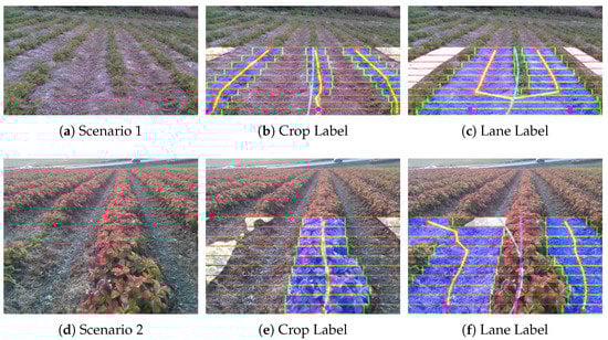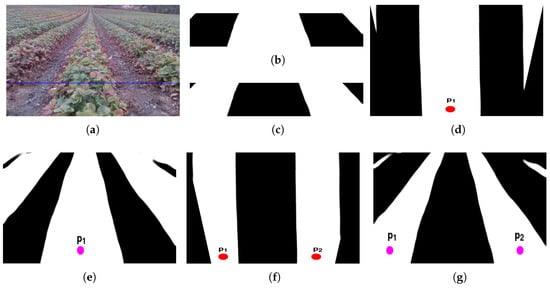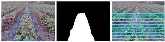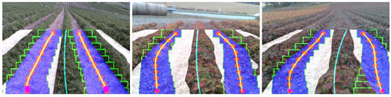 In urban scenarios, the discontinuous lanes are handled by sliding window algorithm [] where the search windows slide in increments for fitting the driving regions. Similarly, in agricultural cases, blobs [], or clusters of pixels are used for segmenting the crop regions. Similarly, ref. [] proposed the concept of multi-ROIs on crop row segmentation that describes the center points estimation of the crops given the inter-row spacing beforehand and applies linear regression over the predicted center points.
