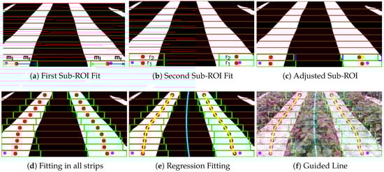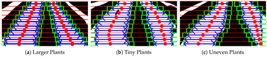 Unlike the standard multi-ROI approach, the proposed adaptive multi-ROI based algorithm can dynamically change its path if a row is slanted (Figure 9a) or tiny plants (Figure 9b) or not evenly spaced (Figure 9c). This adaption helps the robot to attain better trajectory generation in visually changing strawberry fields. After the adaptive search scheme, the average label centers have been obtained for regression fitting to estimate the guided line. Algorithm 1 gives an overview of the overall crop row fitting process.