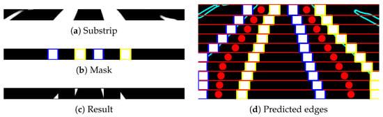 - When one of the search stopping criteria is met, the distance between the center and or have been updated as new margin values or . The mean of the white pixels within updated ROI bounds has taken as the new label centers for nth substrip and repeat the entire process for the next substrip until the last substrip is searched (Figure 8d).