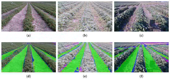 Presents the example input images during different stages of the harvesting season (a–c) and their CNN segmentation results for the lane class (d–f). Green is correct prediction, blue is undetected soil, magenta is undetected vegetation. Best viewed in color.