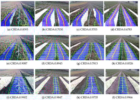 At first, the standard multi-ROI was tested on the image sets for evaluating its performance. The multi-ROI fitting performed over the predicted image for the lane label. It is noticeable that the multi-ROI fitting could not handle the change in width among the crop rows (Figure 12a–d). These led to the incorrect estimation of the centerline, which makes the robot deviate from the driving region. To overcome this problem, the adaptive multi-ROI is introduced, which does an incremental search algorithm along the strip for estimating the ROI margins. The search algorithm finds the exact margins for each ROIs in all the test cases. The predicted labels in Figure 12e–h detail the centerline generation over the estimated centers on two of the predicted lanes region. Then, the centerline has been determined by regression fitting with the average points of both lines. Similar tests have been performed with the crop label where only one crop has fitted (Figure 12i–l); therefore, the fitted crop was taken as the centerline.