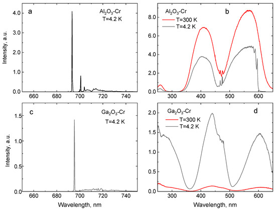 Luminescence (a,c) and luminescence excitation spectra (b,d) of Al2O3-Cr and Ga2O3-Cr crystals.
