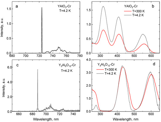 Luminescence (a,c) and luminescence excitation spectra (b,d) of YAlO3-Cr and Y3Al5O12-Cr.