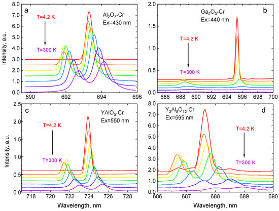Inspection of the data presented in Figure 6 shows that the wavelength shift of the R-lines is insignificant at low temperatures. In YAlO3-Cr and Ga2O3-Cr, the lines start to exhibit a recognizable departure from a near constant at T > 70 K, while, in Cr-doped Al2O3 and Y3Al5O12, the onset of the changes is at an even higher temperature (ca. 100 K). This defines the lower limit of a temperature range where each crystal can be used for temperature monitoring based on the wavelength shift of R-lines.