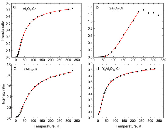 Temperature changes of the luminescence intensity ratio of R-lines () in Al2O3-Cr (a), Ga2O3-Cr (b), YAlO3-Cr, (c) and Y3Al5O12-Cr (d). The red lines show the best fit of experimental results (black dots) to Equation (1) using the parameters presented in Table 2.