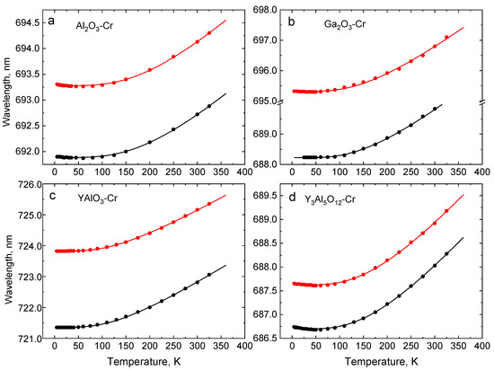 Positions of the R1- (red) and R2- (black) lines in Al2O3-Cr (a), Ga2O3-Cr (b), YAlO3-Cr (c), and Y3Al5O12-Cr (d) as a function of temperature. The dots are experimental data points and the curves show the best fit of experimental results for Equation (2), using parameters presented in Table 2.