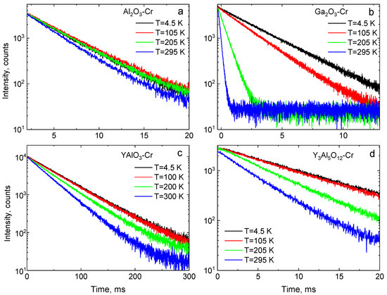 The luminescence decay curves of Cr3+ emissions in Al2O3-Cr (a), Ga2O3-Cr (b), YAlO3-Cr (c), and Y3Al5O12-Cr (d).