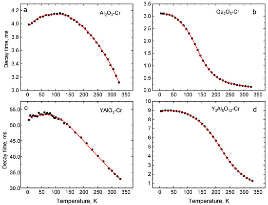 Temperature dependence of the luminescence decay time constant of Cr3+ emission in Al2O3-Cr (a), Ga2O3-Cr (b), YAlO3-Cr (c), and Y3Al5O12-Cr (d). The curves show the best fit of Equation (5) to the experimental results with the fit parameters presented in Table 4.