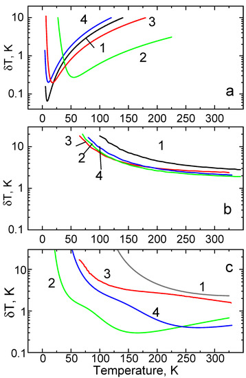 The temperature dependence of the thermometric resolutions for the crystals discussed here are presented in Figure 9a–c. All the plots demonstrate a significant (in some cases, more than two orders of magnitude) variation of over the temperature range of interest. To compare the relative sensitivity of different crystals and in different regimes of temperature measurements, we use a value of = 1 K as a separator between high and low resolution of a temperature sensor. The temperature resolution typically reported for non-contact luminescence sensors using decay time and intensity ratio techniques can vary over a broad range from 5 × 10−3 to 5 K [2,6,8,9,23,27,38,56,74,87,88,89,90].