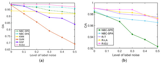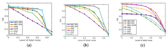 HYDICE Urban data set, R-EU, with the reference methods. With increasing levels of label noise, the performance of the GGF and SVM deteriorates significantly, while NBCs, KNN and the proposed methods are more stable in terms of OA. The classification accuracy of all the three analysed strategies is depicted in