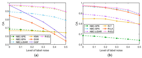 at each level of label noise. R-LA outperforms the three NBCs, i.e., NBC-Spe, NBC-Spa and NBC-LiDAR, at low levels of label noise (