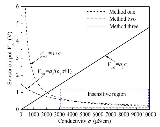The relationships between the conductivity and the sensor output of three typical conductivity detection methods.