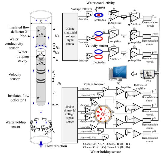 For the gas-liquid two-phase flow, the water holdup and the mixture velocity are the two main measurement parameters. Based on these two parameters, the individual superficial velocity can be derived. For the water holdup measurement, the water holdup sensor must have a sensitive and homogenous detection field to deal with the non-uniform phase distribution and different flow structures. Due to the variable water conductivity, a water conductivity sensor is needed to acquire the water conductivity information. For the mixture velocity measurement, the velocity sensor must be able to acquire the cross-correlation velocity and make it easy to deduce the mixture velocity from the cross-correlation velocity. Based on this strategy mentioned above, we designed a combined sensor system, which is shown in Figure 3. The rotating electric field conductance sensor, which has a sensitive and homogenous detection field, was selected as the water holdup sensor. The water holdup sensor consists of four pairs of electrodes, and the field angle θ, axial height H, and radial thickness T of the electrodes are 22.5°, 4 mm, and 1 mm, respectively []. In this study, in order to apply it to the gas-water two-phase flow with water conductivity change, its circuit was improved. The eight-channel sinusoidal voltage signals with 20 kHz frequency and phase difference of 45° are generated by a designed sinusoidal voltage signal source. Because of the salinity change in gas-water two-phase flow, the voltage signal source must have a very high load capacity. Therefore, in this study, eight-channel sinusoidal voltage signals were applied to the electrodes through eight voltage followers, which can improve the load capacity. In addition, the circuit parameters were designed to make the circuit work well under the water conductivity variation conditions. The outputs of the four channels , , , and , are:
