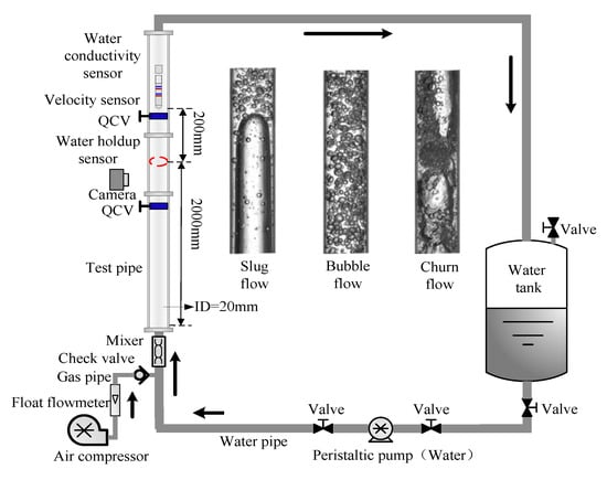 In order to verify the methodology for flow measurement in gas-water two-phase flow with water conductivity change, experiments were carried out on the flow loop facility, which is shown in Figure 4. The air produced by an air compressor and water solutions with different conductivities ( = 1000 , 4000 and 8000 ) was the experimental media. A float flowmeter metered the flux of gas, and the flux of water was transported and controlled by an industrial peristaltic pump. The test pipe with inner diameter of 20 mm was made of acrylic material, and the sensors were respectively mounted in the test pipe. In the experiment, the gas superficial velocity Usg was set from 0.0553 to 0.5888 m/s, and the water superficial velocity Usw ranged from 0.0368 to 1.1789 m/s. The flow patterns, including slug flow, bubble flow, and churn flow, were produced. The output signals of the sensors were all sampled by the data acquisition card PXI-4472 of NI Company. The flow patterns were recorded by a high-speed camera and the real water holdup was obtained by quick closing valves (QCVs) in the process of the experiment.