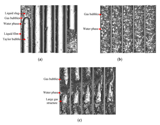 The high-speed camera images of three flow patterns are shown in Figure 5, by which the flow patterns can be identified, and they can also help us understand the flow structures in the experiment. For slug flow, Taylor bubbles occupy almost the entire cross section of the pipe, and liquid film forms between the Taylor bubbles and the pipe wall. Large numbers of gas bubbles distribute in the liquid slugs, which are similar to bubble flows. Taylor bubbles and liquid slugs appear alternately. For bubble flow, large amounts of gas bubbles with a small size distribute in the water with intense random movement. In churn flow, the large gas structures are similar to Taylor bubbles, and liquid slugs are similar to bubble flows. These two structures appear to be inconsistent and disordered.