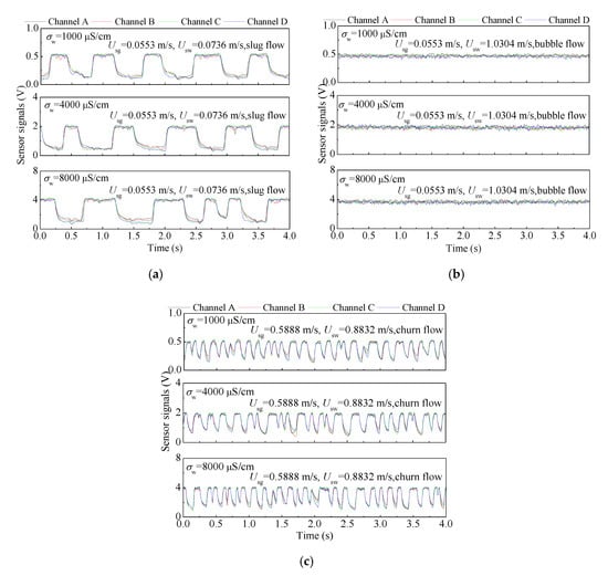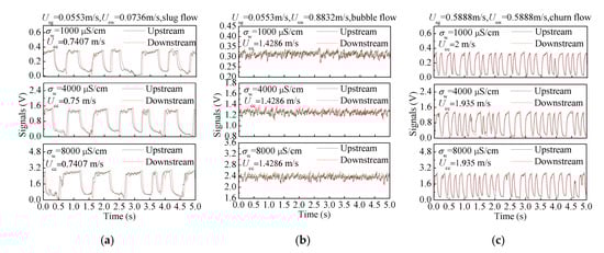 The signals of the velocity sensor and calculation results under three typical flow patterns and different water conductivities: (a) Slug flow; (b) Bubble flow; (c) Churn flow.